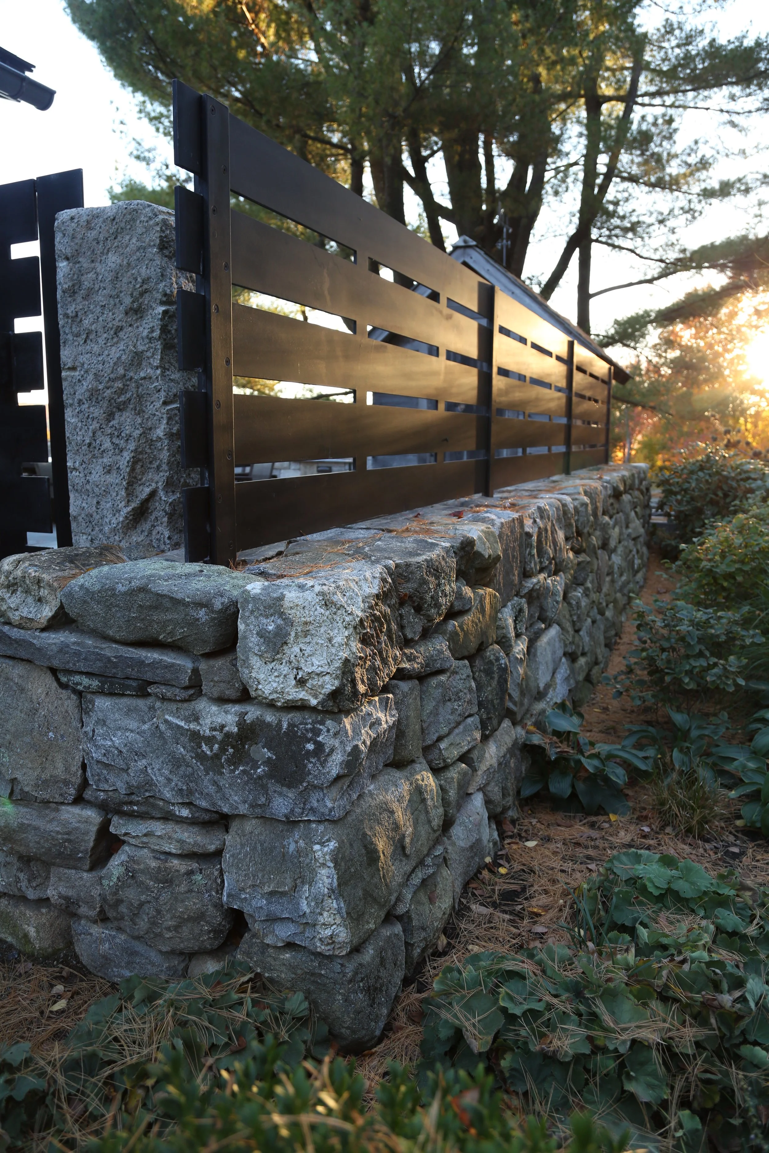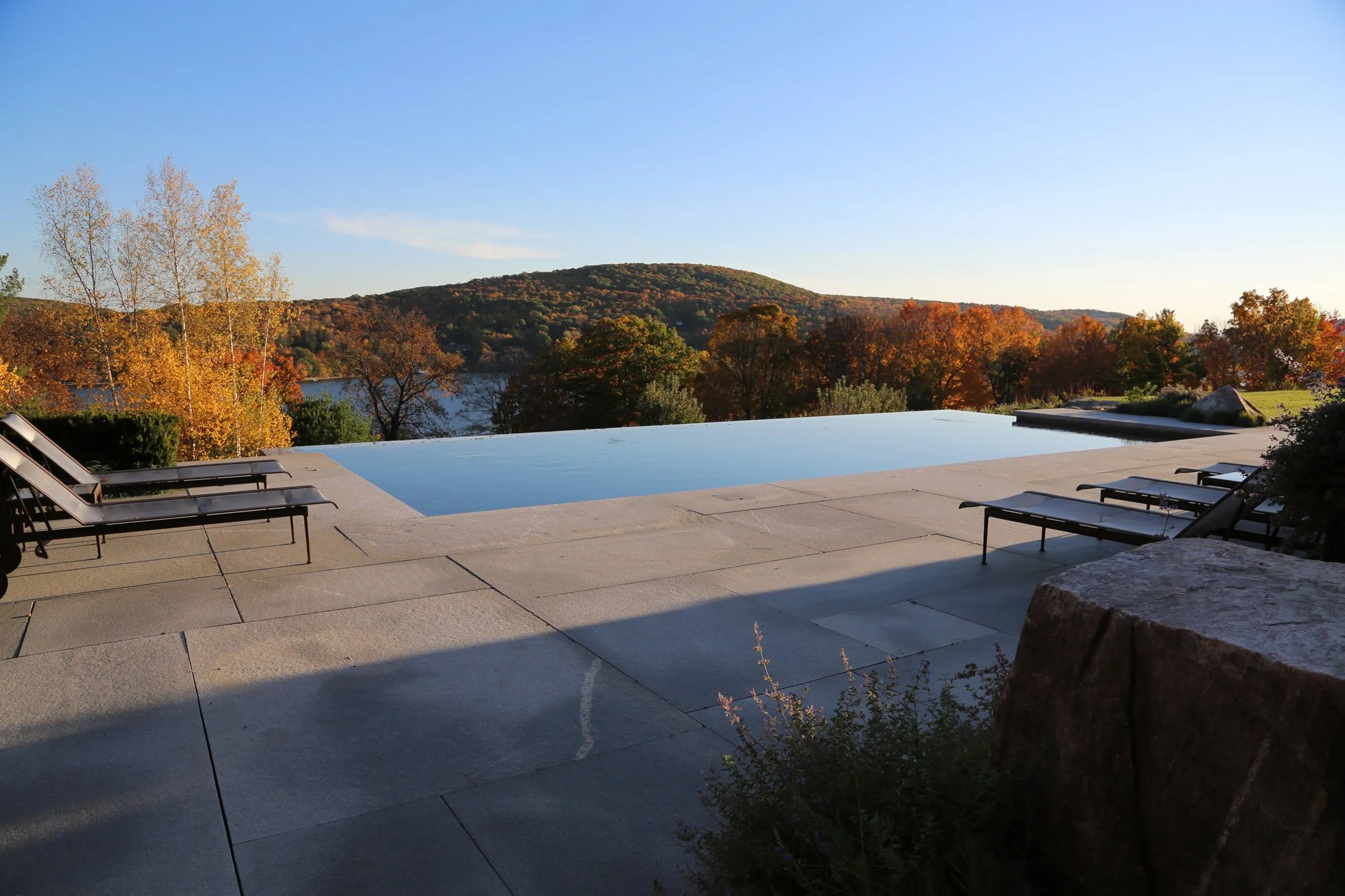 Both cut granite and natural granite flagstone were used - cut stone where needed around the pools, and more rustic layouts at the pergola - to offer variety and interest. Metal gate details a reclaimed cobble driveway also add interest and a sense of connection to the local landscape. As the lake was key to the design, the pool and hot tub were created to step down ones view to the lake - water on water on water makes for a great view!