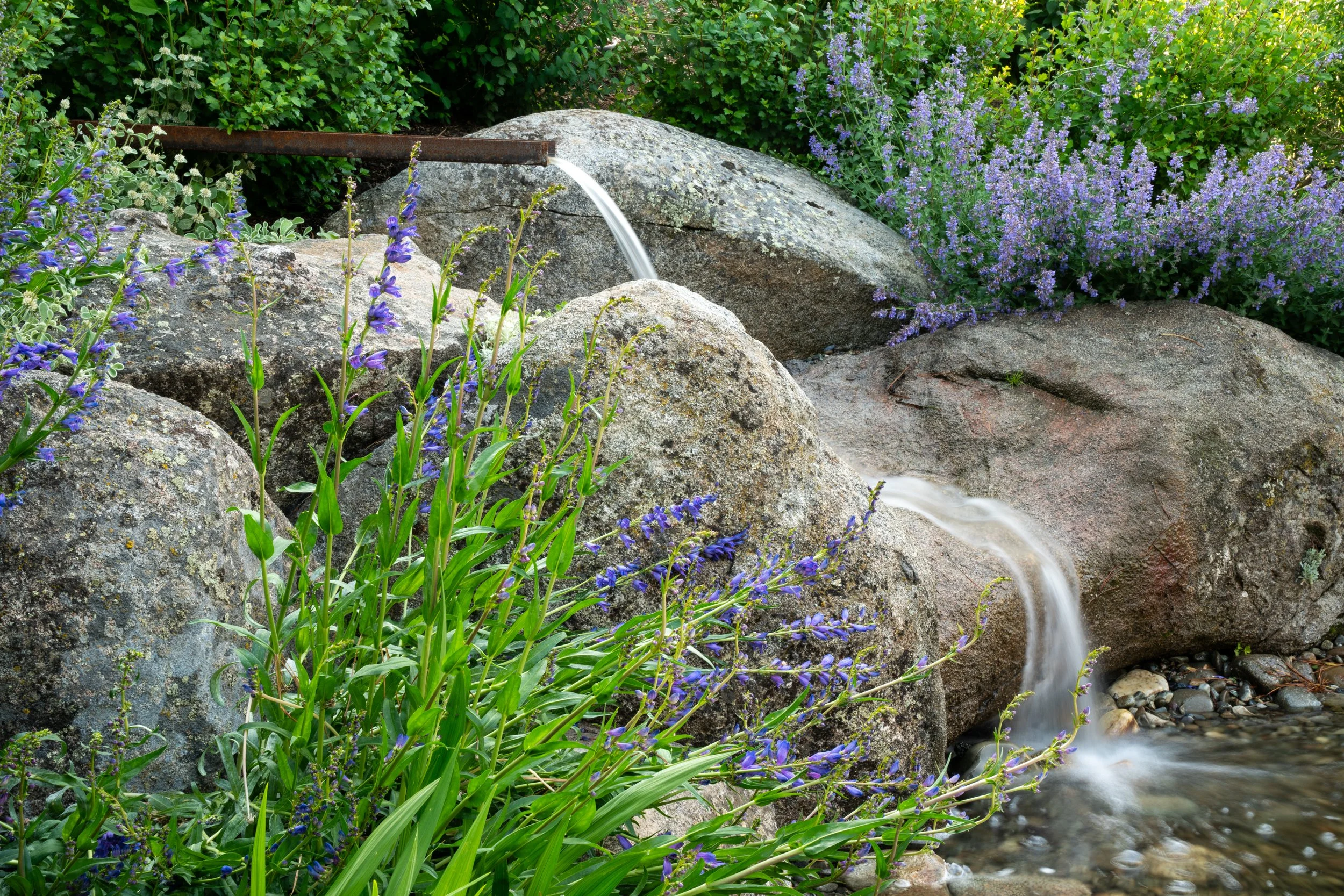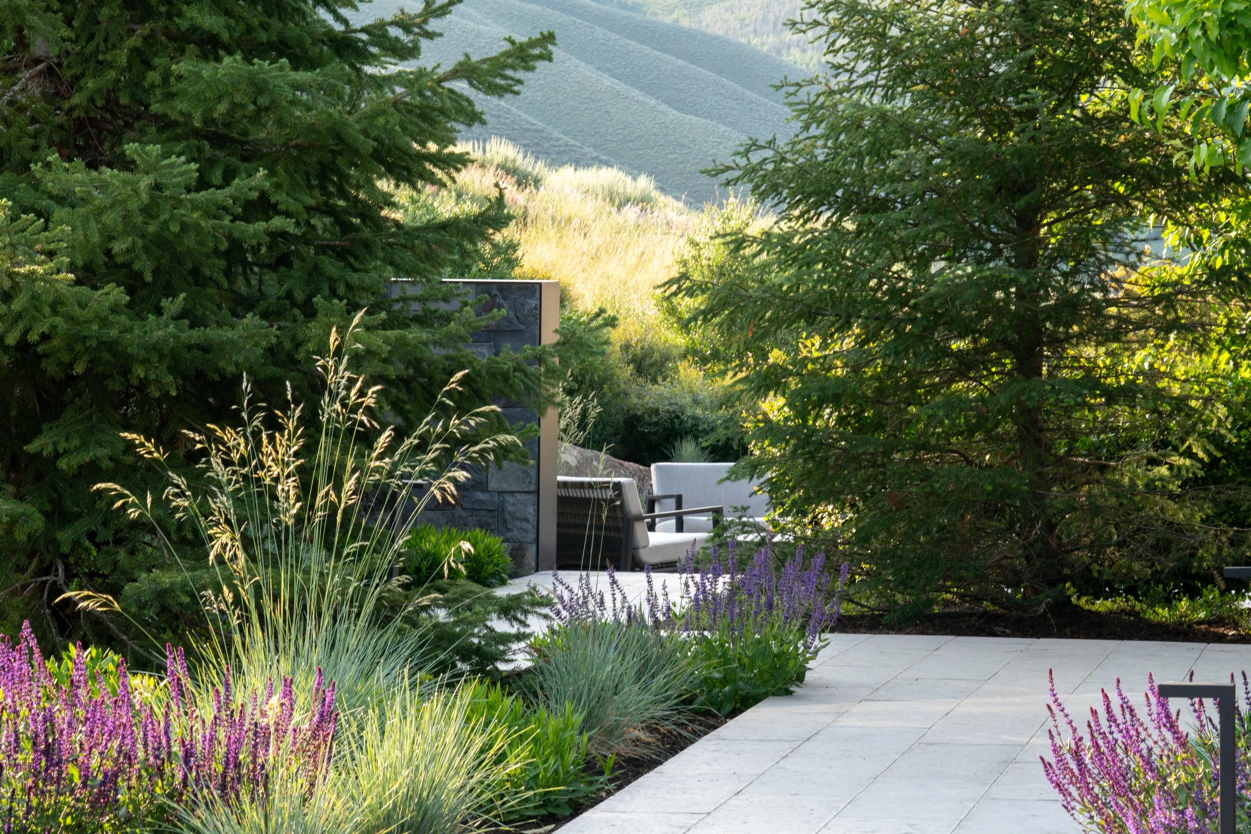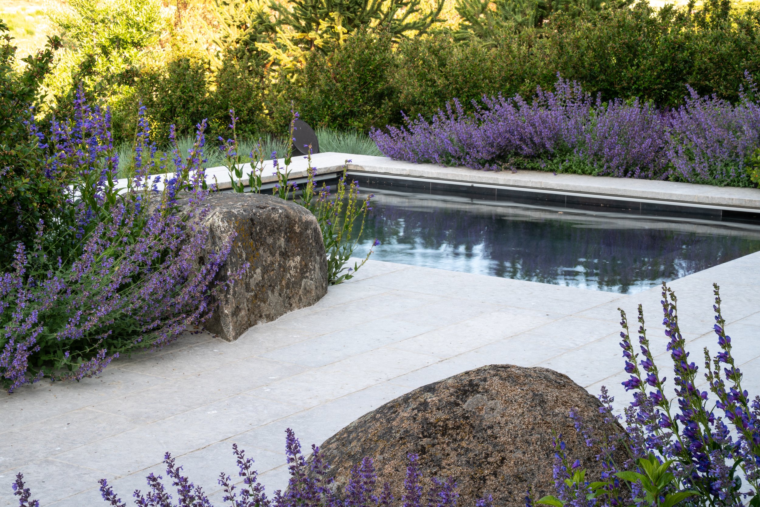 Tucked away on a hillside this garden integrates with the natural surroundings and also sets aside built spaces that create a cozy and fun vibe. Here we used large boulders and a subtle use of water as a nod to a mountain brook. The small pool holds its own space; a sunken seating area takes advantage of the east side of the property to create a cool evening spot.